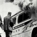 On Mother’s Day, May 14, 1961, a Greyhound bus carrying Freedom Riders arrived at the Anniston, Alabama, bus station shortly after 1 pm to find the building locked shut. Led by Ku Klux Klan leader William Chapel, a mob of 50 men armed with pipes, chains, and bats smashed windows, slashed tires, and dented the sides of the Riders’ bus. Though warned hours earlier that a mob had gathered at the station, local police did not arrive until after the assault had begun.